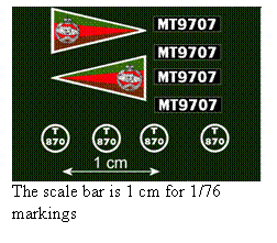Markings for T870 (MT9707) are shown as used on exercises. The RAC pennants were placed on the sides of the turret bustle, pointing to the rear. The MT9707 number plates were placed as shown in my drawings. The T870 markings were placed towards the rear of the sides of the mudguard stowage bins.