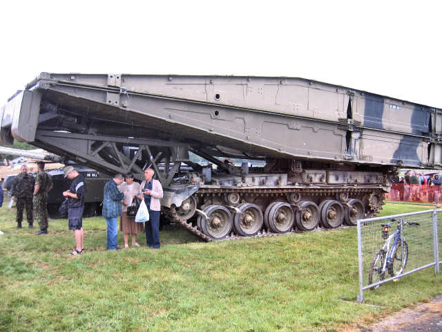 This vehicle was originally designed to lay either the No. 8 or No. 9 bridge. The vehicle pictured here has a No. 8 (scissors) bridge. The alternative No. 9 bridge is a one piece 13.4 m length bridge. The first vehicles were taken into British Army service in 1974, following a long gestation from 1962.