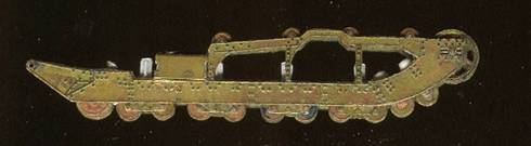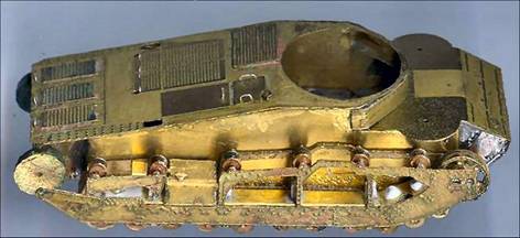 The track design is especially interesting, as the edge of the inner face is sculpted to accept the sprocket teeth and so the sprockets engage on the inside of the outer edges of the track. This can be seen clearly on the Medium Mark II at Bovington. Each track was fabricated from 3 pieces: outer face, inner face and guides. The inner face had an etched central locating groove to take the track guides. The two faces were staggered so as to provide an overlap for joining the two ends. I used UHU for joining the faces back to back and superglue for locating the track guides. A miniature soldering iron could be used. The track guides are best positioned at the same time as track fitting. Otherwise they may become detached when the track is bent to shape.