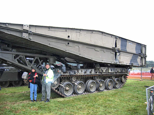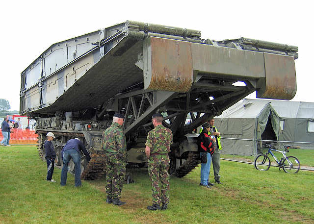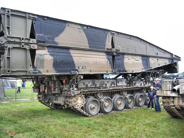 This vehicle was originally designed to lay either the No. 8 or No. 9 bridge. The vehicle pictured here has a No. 8 (scissors) bridge. The alternative No. 9 bridge is a one piece 13.4 m length bridge. The first vehicles were taken into British Army service in 1974, following a long gestation from 1962.