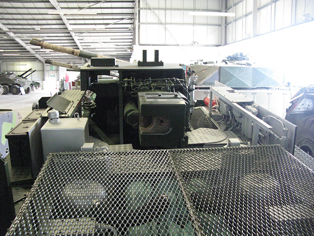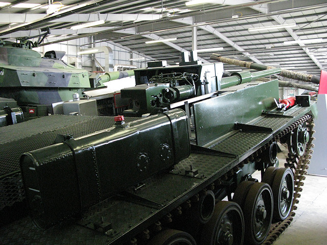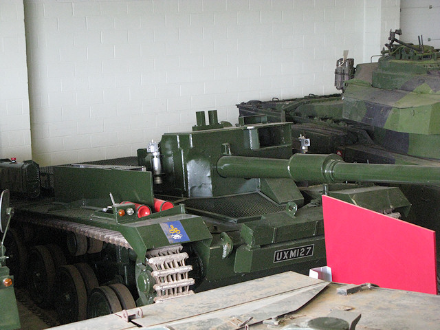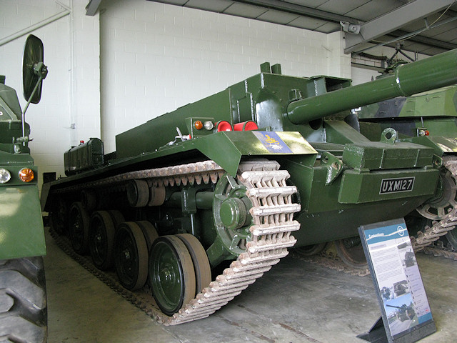 Arcane indeed! This vehicle was built on a shortened Comet chassis with hydraulically adjustable suspension for gun elevation this was an experiment along the lines of the Swedish S-tank. Originally envisaged as a low profile air-transportable vehicle, the exhibit at Bovington has a 105 mm gun.