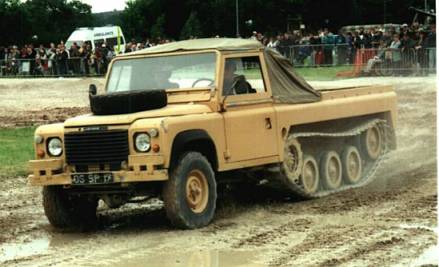 This vehicle was developed by Laird of Anglesey. It uses shortened CVR(T) running gear for the tracks and the rest of the vehicle is the familiar Land Rover. It weighs approximately 3 tonnes and has a maximum speed of ~50 mph. This development dates from around 1978, but was ultimately not a successful design, despite much initial interest. There were six built with Stage 1 front sections and a seventh using a 110 front. This latter vehicle is the only one in overall sand finish. It is an unusual vehicle and fully deserving of a place amongst the other tracked vehicles on this site. The pictures were taken by myself at Bovington Tank Fest 2002 and The War and Peace Show 2002. |